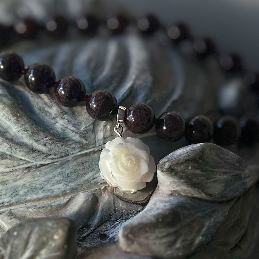 Rose sauvage est un collier en perles de grenat rouge foncé 100% naturelles avec un pendentif amovible en forme de rose taillé en nacre blanc, que vous pouvez enlever selon l’occasion. Spéciale pour les femmes modernes et audacieuses. Vous pouvez le porter aussi bien avec un jean pour aller en terrasse ainsi qu’avec une robe pour une soirée…