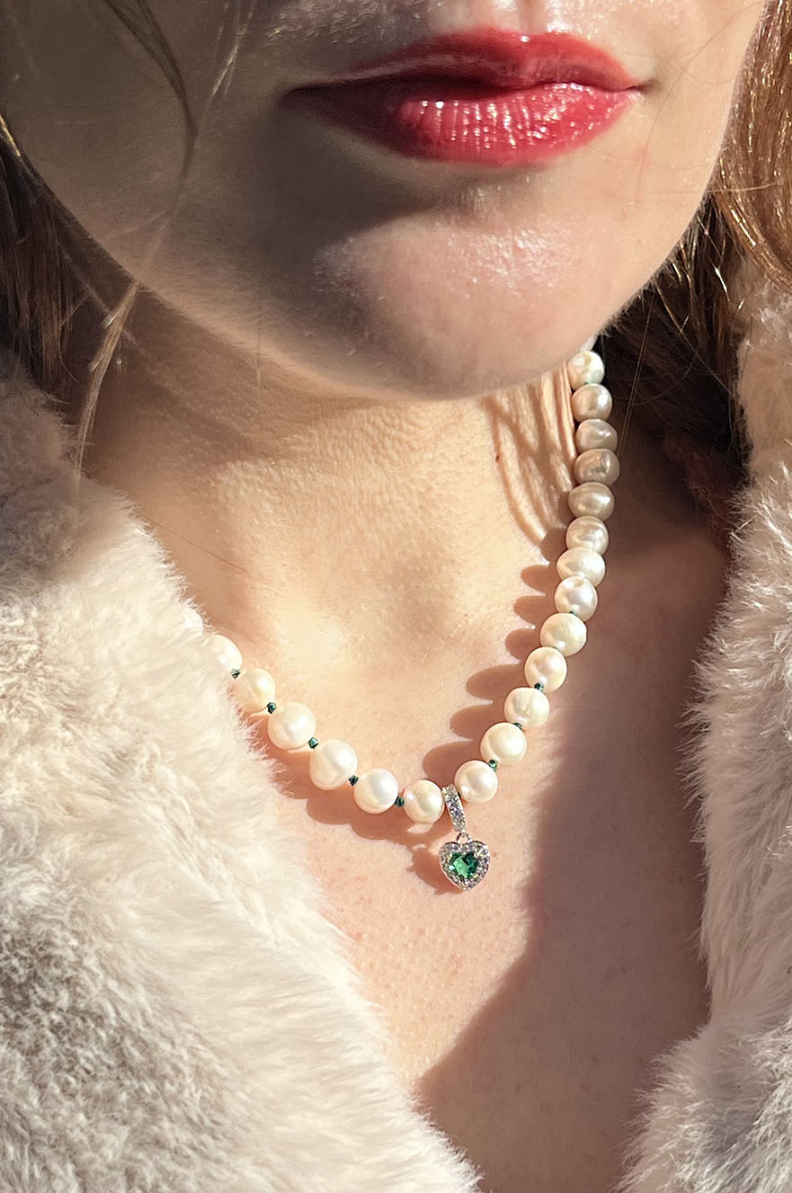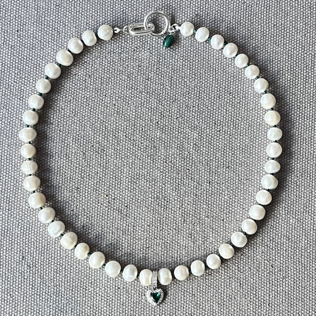 COLLIER COEUR VERT ET PERLES DE CULTURE