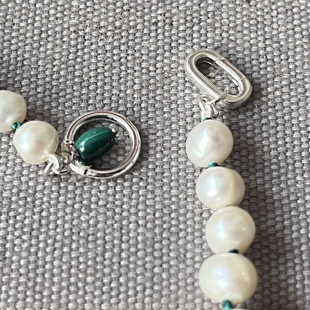 Moderne et résolument romantique, ce collier de perles de culture blanches est sublimé par un pendentif cœur en argent orné d’une pierre verte éclatante. Chaque perle est enfilée à la main sur un fil de soie vert émeraude, avec des nœuds entre chaque perle, qui apporte souplesse, sécurité et une finition raffinée au collier. Ce collier se porte près du cou et met délicatement en valeur le décolleté. La touche de vert apporte une note de modernité et d’originalité, idéale pour celles qui aiment les bijoux élégants mais affirmés. À porter lors d’un dîner romantique, d’un mariage, d’une soirée ou simplement pour sublimer une tenue du quotidien, ce bijou se distingue par son design unique.