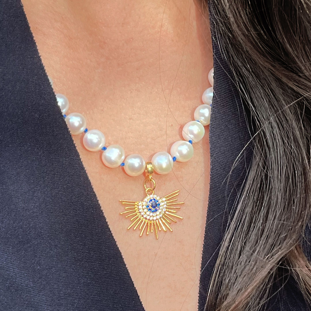 Le collier Soleil Bleu va illuminer votre décolleté. Laissez vous porter par la beauté de ses perles de culture blanches, enfilées avec un délicat fil de soie en couleur bleu marine créant un magnifique contraste. Un pendentif central en forme de soleil qui apporte une touche sophistiqué.  Idéale pour vos soirées ou occasions spéciales.